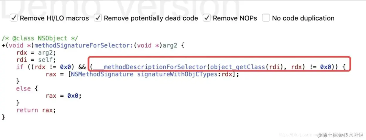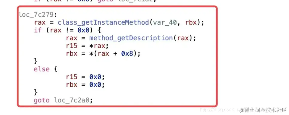 ___methodDescriptionForSelector的伪代码实现,结合汇编的堆栈打印,可以看到,在___methodDescriptionForSelector这个方法中调用了objc4-781的class_getInstanceMethod -