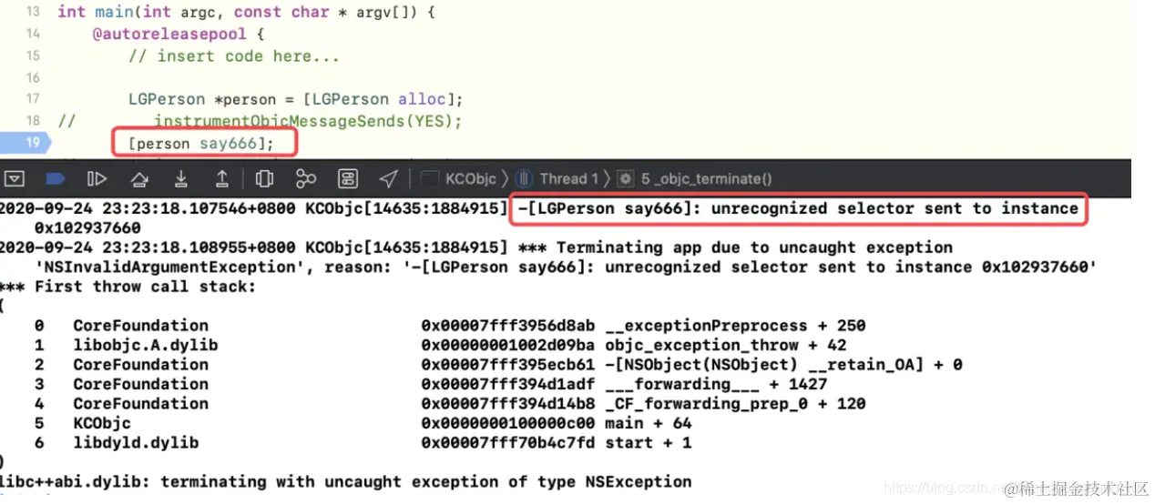 看着objc_defaultForwardHandler有没有很眼熟,这就是我们在日常开发中最常见的错误:没有实现函数,运行程序,崩溃时报的错误提示。