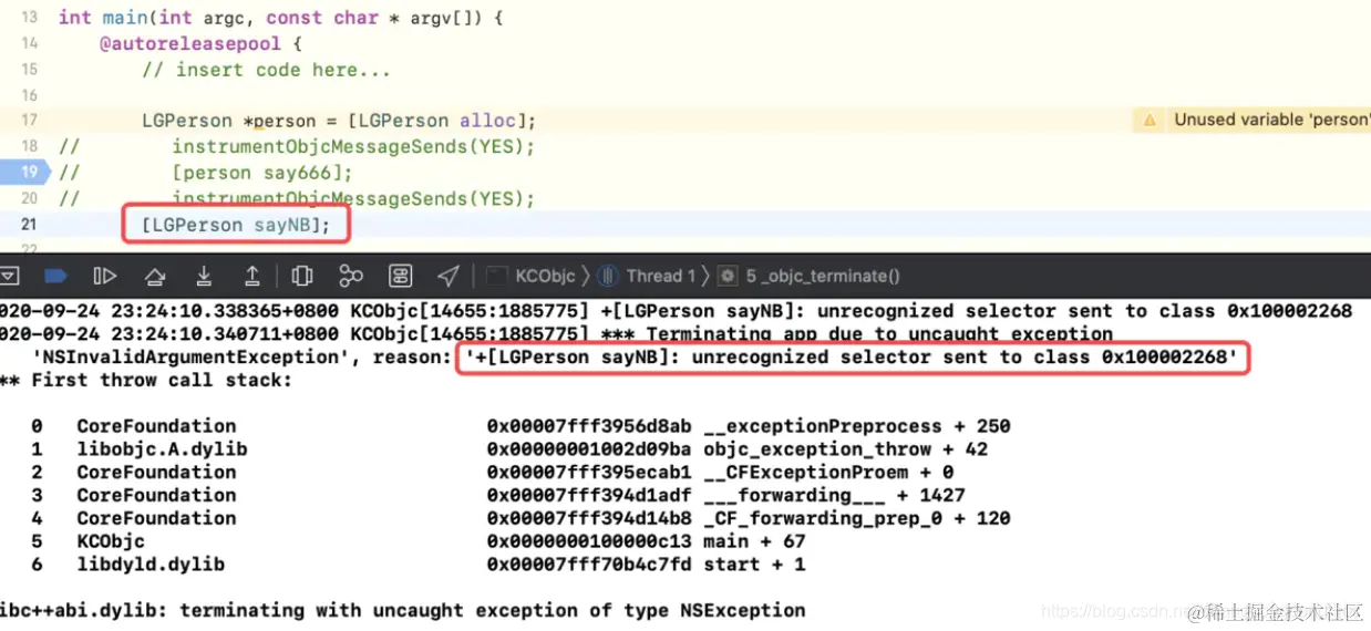 LGPerson的实例方法say666和类方法sayNB,运行程序,均会报错,提示方法未实现,如下所示-