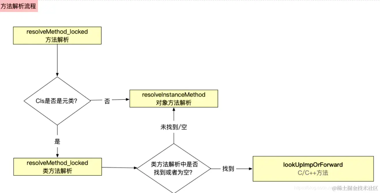 发送resolveInstanceMethod消息前,需要查找cls类中是否有该方法的实现,即通过lookUpImpOrNil方法又会进入lookUpImpOrForward慢速查找流程查找resolveInstanceMethod方法- 如果没有,则直接返回