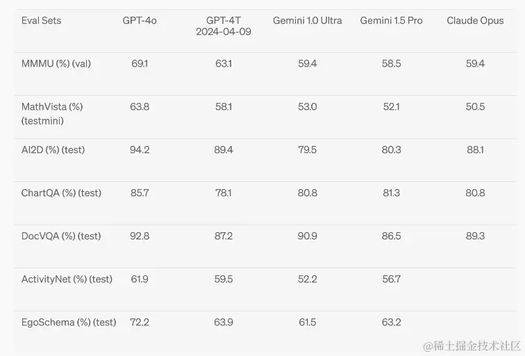 视觉理解评估:GPT-4o 在视觉感知基准测试上达到了最先进的性能。所有的视觉评估都是在没有任何先前示例的情况下完成的(0-shot),包括 MMMU、MathVista 和 ChartQA 这些测试都采用了0-shot链式推理(CoT)方法。
