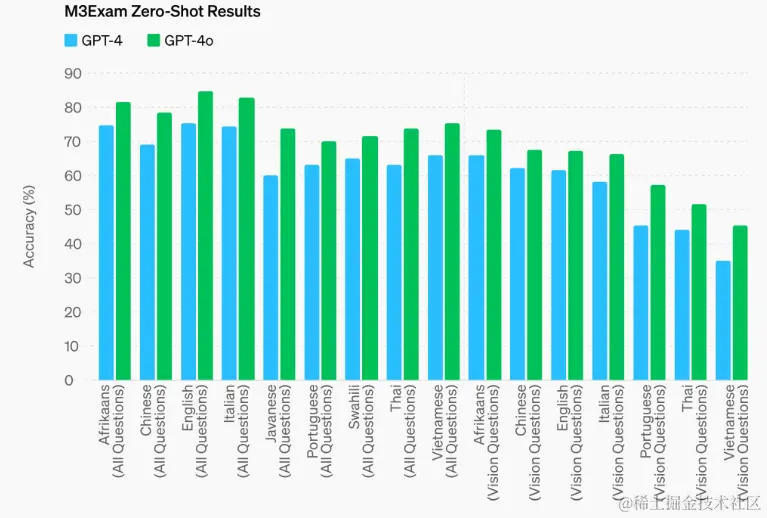 M3Exam 基准:M3Exam 基准测试同时涉及多语言和视觉评估,包含了来自不同国家标准化考试的多项选择题,题目中有时会出现图表和示意图。在所有语种的这项测试中,GPT-4o 相比 GPT-4 显示出了更优的表现。