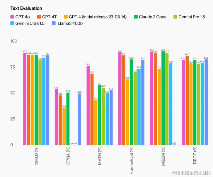 文本评估:GPT-4o 在推理能力上取得了显著的进步——在不提供初始样本常识性问题测验( 0-shot COT MMLU)中,GPT-4o 取得了88.7%的高分记录。这些评测结果是使用我们新开发的简易评测库(链接将在新窗口中打开)来收集的。同时,在传统的提供五个样本(5-shot)无链式推理(no-CoT)的MMLU评测中,GPT-4o 也刷新了纪录,达到了87.2%的得分。