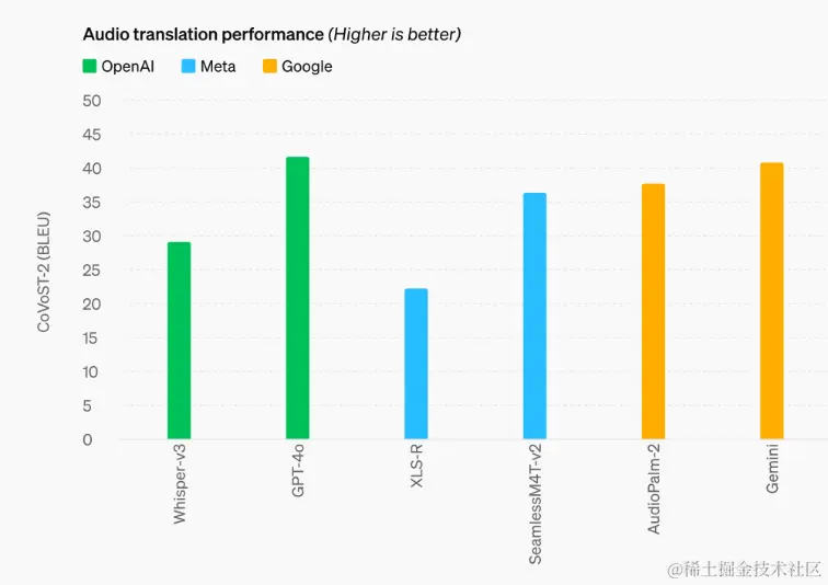 音频翻译性能:*GPT-4o 在语音翻译领域创立了新的行业高标准,并且在 MLS 基准测试中的表现超过了 Whisper-v3。