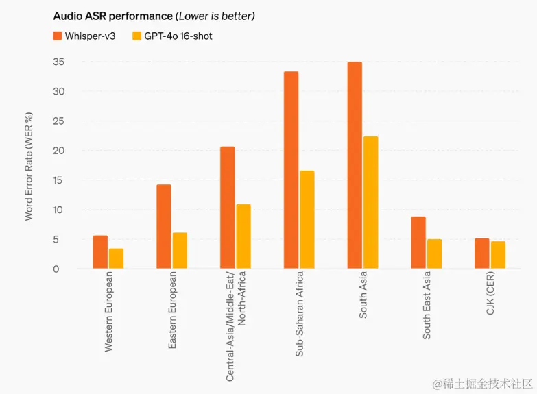 音频语音识别性能:GPT-4o 在语音识别方面相比于 Whisper-v3 取得了巨大进步。无论是资源丰富的语言还是资源较少的语言,GPT-4o 在所有语言上的表现都有显著提升,尤其在那些资源较少的语言上,其改进尤为明显。