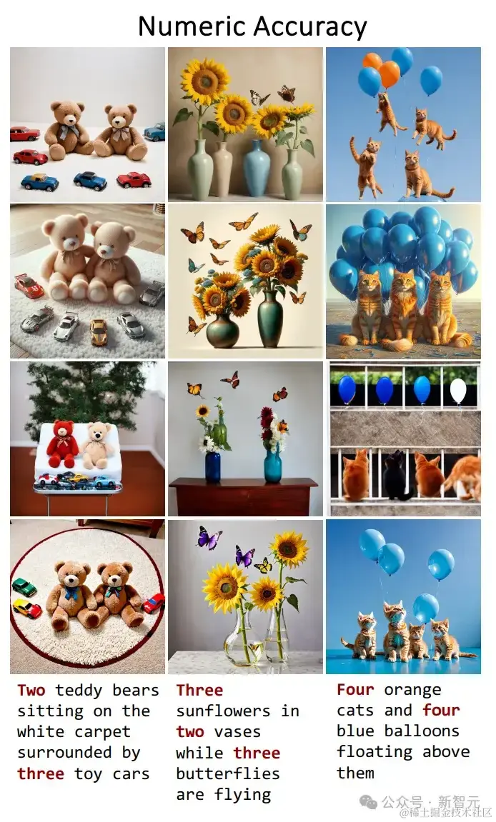 然后是数值准确性,展示顺序同上(SDXL、DALL·E 3、LMD+、RPG):
