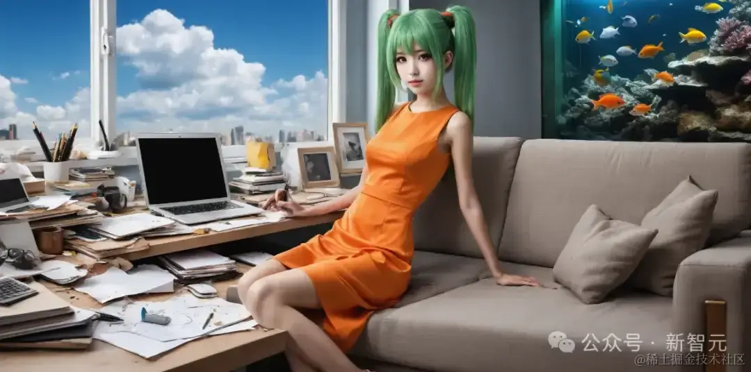 一个穿着橙子连衣裙的绿色双马尾女孩坐在沙发上,左边的大窗户下是一张凌乱的办公桌,沙发右上方是一个活泼的水族馆,现实主义风格。