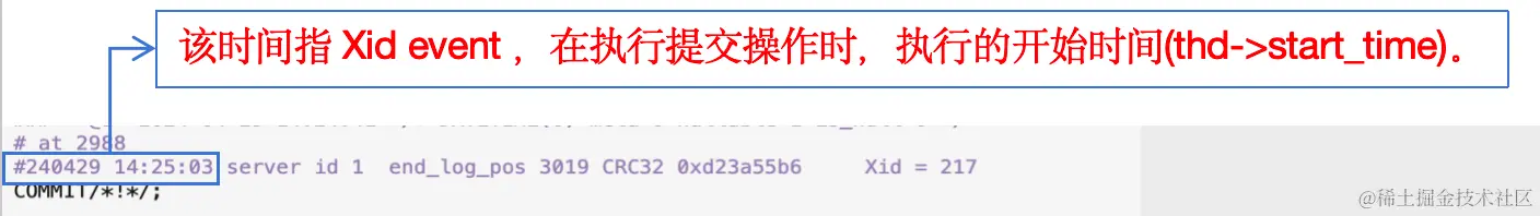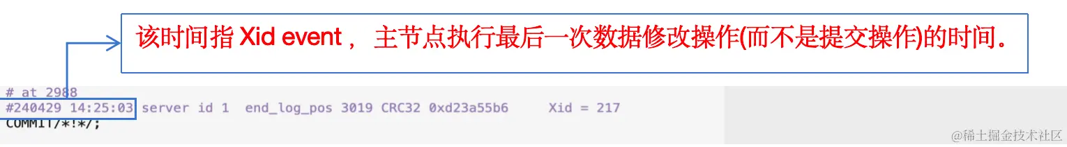 在从节点:对于 GTID Event,MySQL 在解析 Event 时,并不会获取主节点 GTID/XID Event 的时间戳,因此会“继承”该事务上一个操作的时间戳。而从节点所有修改操作的时间戳都来自于主节点执行操作时的时间戳。因此从节点的 GTID/XID Event 的时间即为主节点最后一个修改操作的 timestamp。