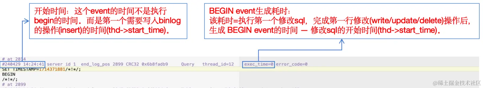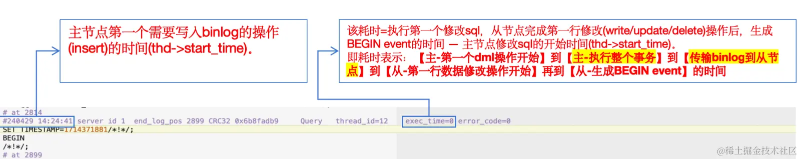 然后,从节点的 exec_time 依然是生成 BEGIN Event 的过程中,获取 最新的时间戳 - timestamp 而得到(注意这里的 timestamp 来自于主节点修改 SQL 的开始执行时间)。