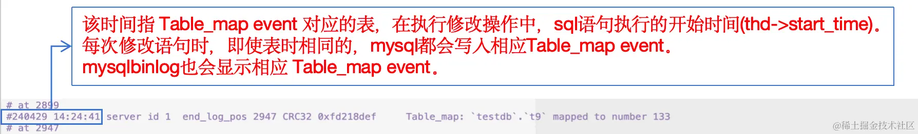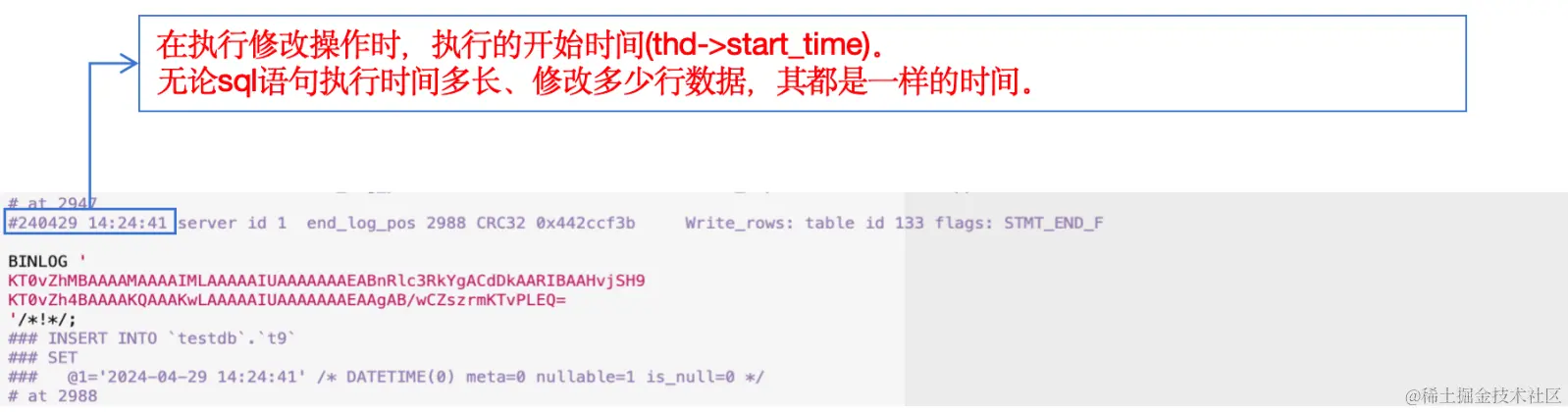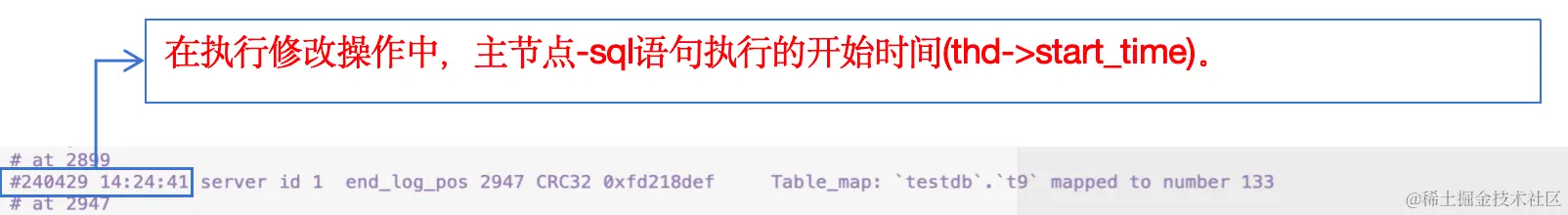 注意:对于主节点 BEGIN event 的 timestamp 并不是执行 BEGIN 时的时间戳,而是执行第一个修改操作。在完成 InnoDB 层第一行数据修改之后,生成并写入 Table_map event。在生成 Table_map event 之前,如果此时整个事务的 binlog 缓存是空的,才会立即获取该操作的 thd->start_time,并生成真正的 BEGIN event。