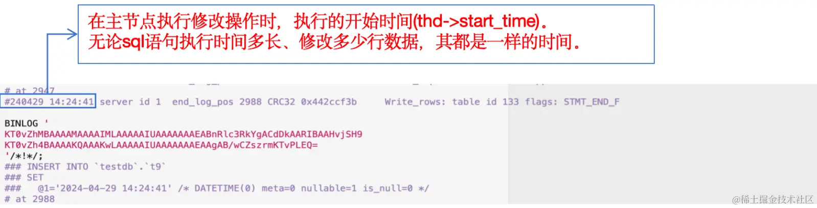 这里的 timestamp 来自于主节点 BEGIN Event 的 timestamp。其实际执行时,是会获取 BEGIN Event 的 timestamp 将其赋值给 thd->start_time/thd->user_time。从节点生成 Event 对象时,继续从 thd->start_time 获取时间戳即可。