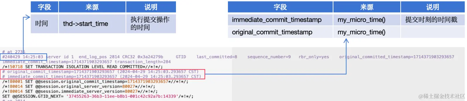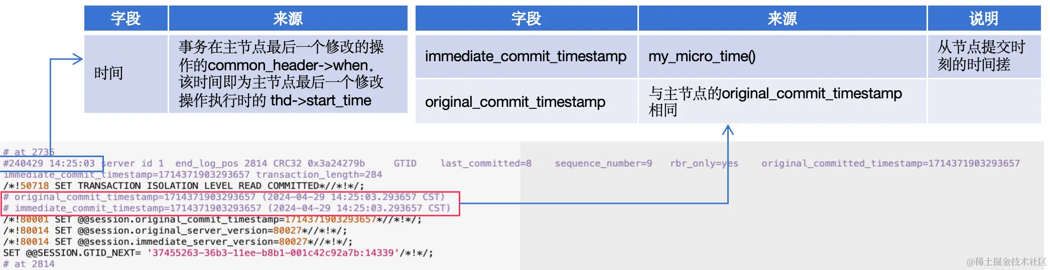 immediate_commit_timestamp 获取从节点提交时刻的时间戳。original_commit_timestamp 从 GTID Event 中的 original_commit_timestamp 获取,即为主节点提交操作的 timestamp。