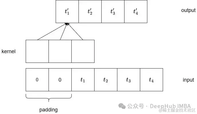 在上图中,我们可以看到一维输入的典型卷积。输入序列左填充零,以确保输出长度相同。