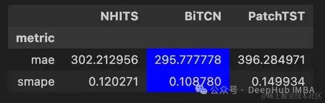 可以看到BiTCN实现了最好的性能,因为该模型的MAE和sMAPE是最低的。