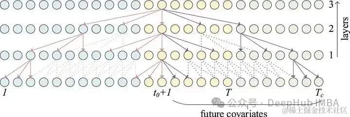 上图额蓝点表示输入序列,黄点表示输出序列,红点表示未来协变量。我们可以看到具有扩展卷积的前瞻性时间块如何通过处理来自未来协变量的信息来帮助告知输出。