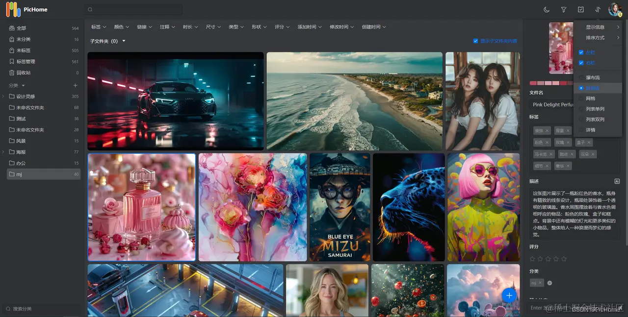PicHome提供了包括瀑布流、自适应布局、网格、列表、双排列表和详细视图在内的多种文件展示模式,以满足不同用户的需求。用户可以根据自己的喜好,选择最适合的展示方式,从而提高文件浏览和管理的效率。