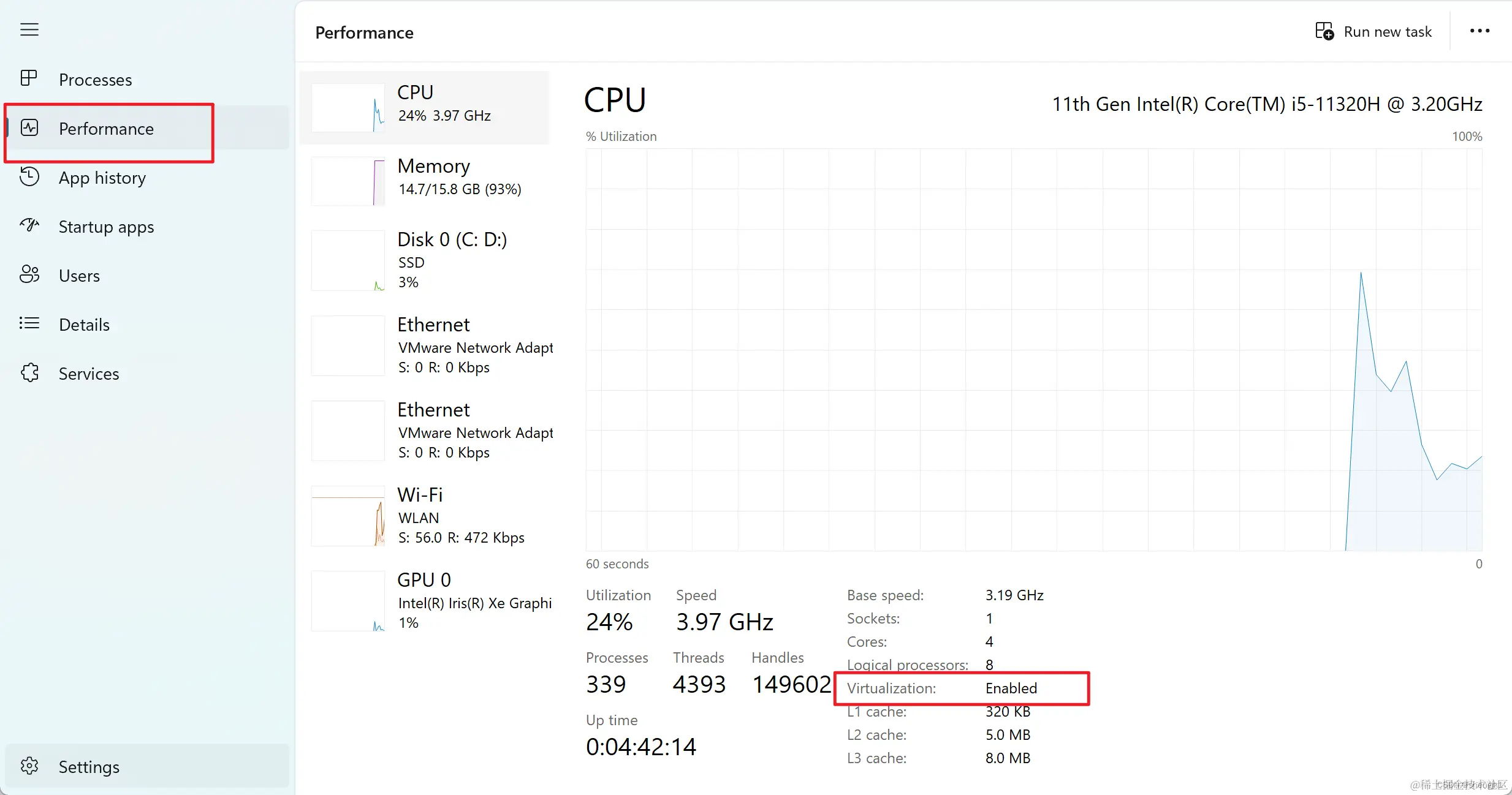 打开任务管理器,如果显示虚拟化已启动,则表示成功,如: