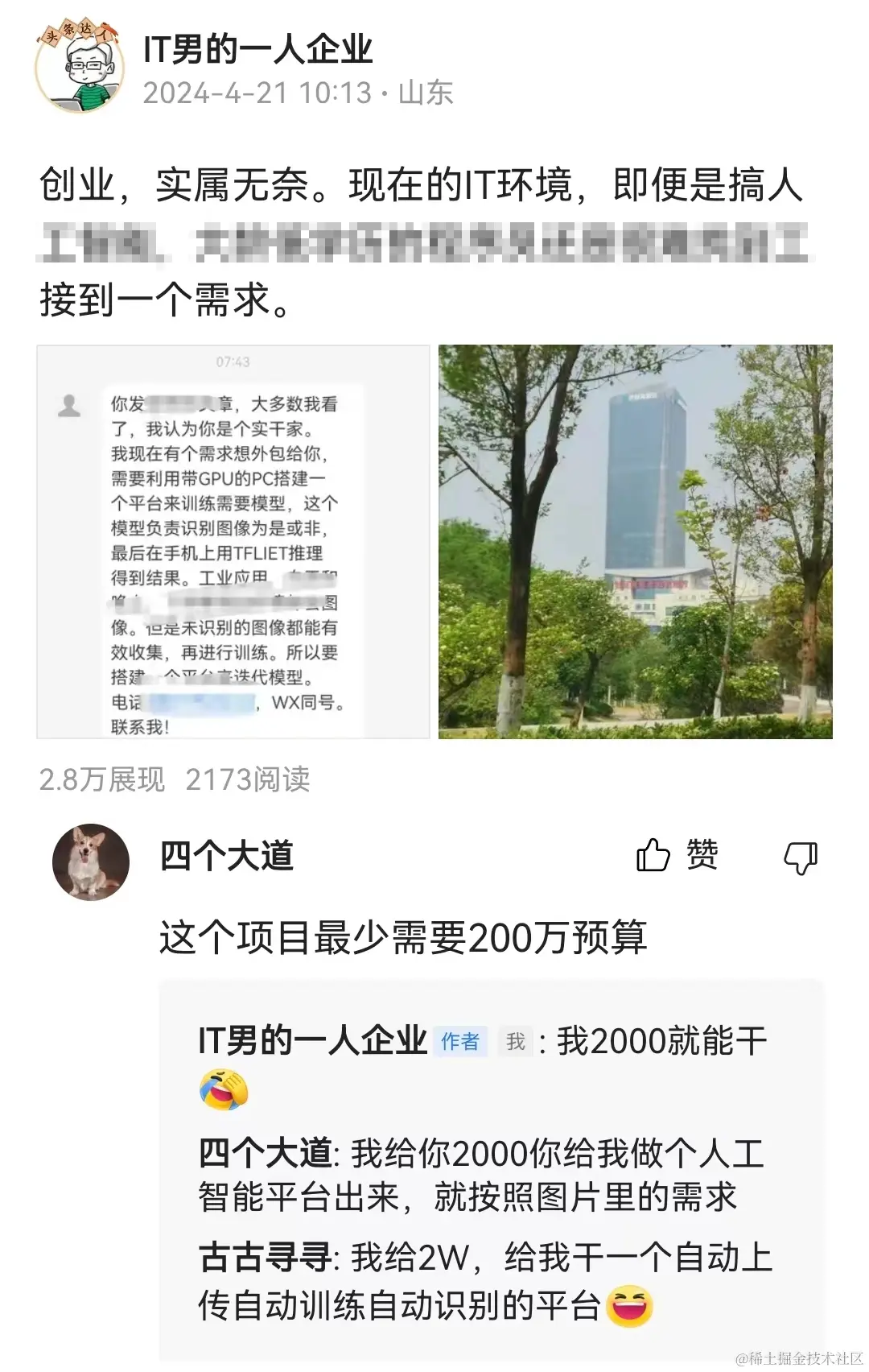 后面有人接着说,他给我2000让我做,也有说给2万的,就做一个自动上传自动训练自动识别的平台。