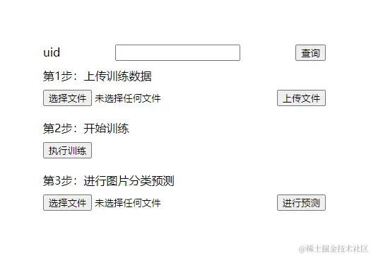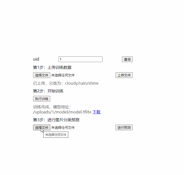 整个流程分为3步,先上传训练数据,也就是那个带分类文件夹的zip压缩文件。第2步执行训练,训练完成后会生成模型。除了服务器用的模型权重,也包括可在嵌入式设备运行的tflite文件。