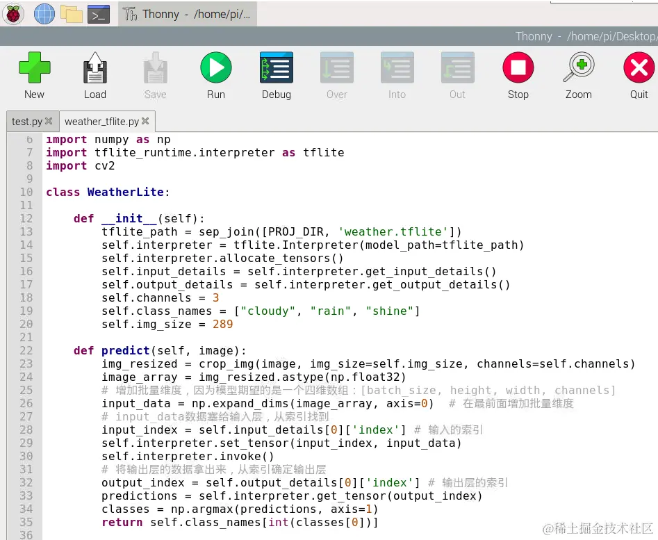 通过导入tflite_runtime库,就可以读取并运行tflite文件。然后将摄像头获取到的图像传给interpreter进行处理。因为是python语言,所以它比Android平台的实现要简单得多。