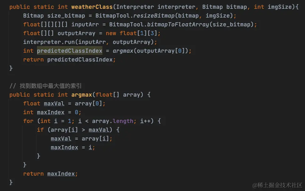 通过把Bitmap包装成模型的输入层,然后交给interpreter.run执行。模型会把预测结果写入到outputArray中。这outputArray里面就包含分类的结果,里面是各个分类的置信度。选出最高的一项,就是最终的分类归属。