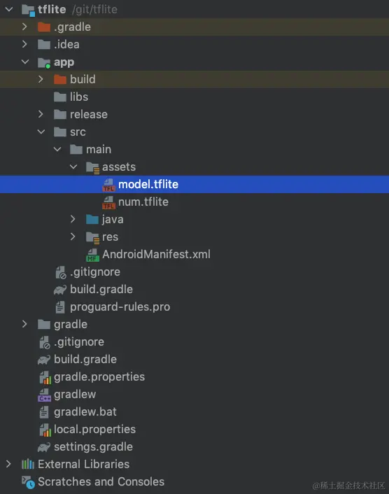这是项目结构,tflite模型放到assets目录下。