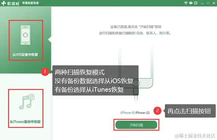步骤2:软件支持从iOS设备/iTunes备份中恢复数据,我们可以根据自己的情况来选择扫描模式,再点击**【扫描】**按钮。