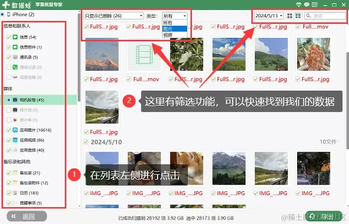 步骤3:手机数据扫描完成,在扫描界面左侧列表进行选择,比如点击**【相机胶卷】。在展示照片、视频的界面中,我们可以通过【筛选器】**快速找到要恢复的数据。