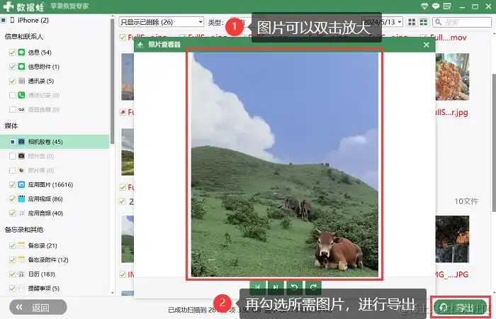 步骤4:我们还可以双击预览照片,再进行照片的勾选,点击**【导出】**按钮。手机数据成功导出,电脑会自动弹出我们刚刚保存的位置。
