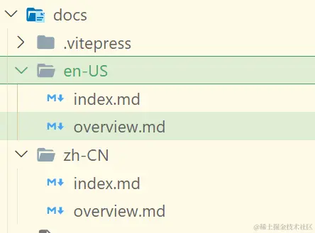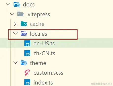 要想支持主题多语言需要配置 locales,新建 ./docs/.vitepree/locales目录来存放主题多语言配置文件,统一以语言名称命名: