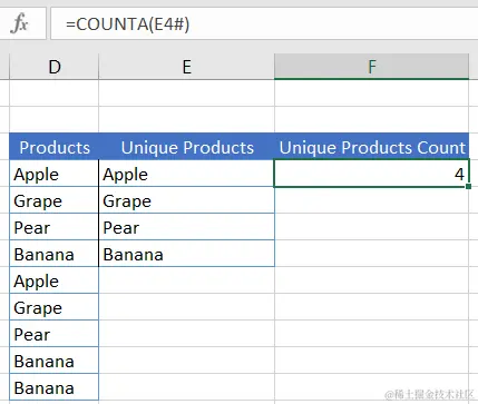 例如,若要查找单元格 E4 中应用的 UNIQUE 公式提取了多少个唯一值,请提供对 COUNTA 公式的溢出范围引用,如下面的代码所示:
