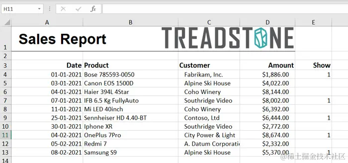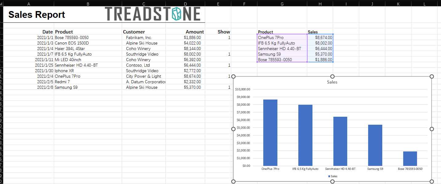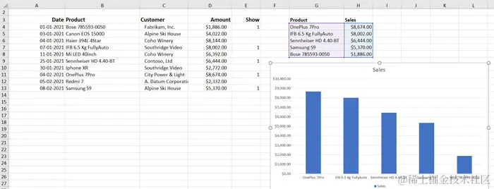 现在将开始提取相关数据,以便在图表中进行绘制。我们将根据产品的销售额绘制图表。因此,图表数据应包含来自产品列和金额列的数值。从这两列中提取特定数值的标准是基于展示列。我们将从展示列的值为1的每一行中提取产品和金额数值,并在图表上绘制这些筛选后的数据。