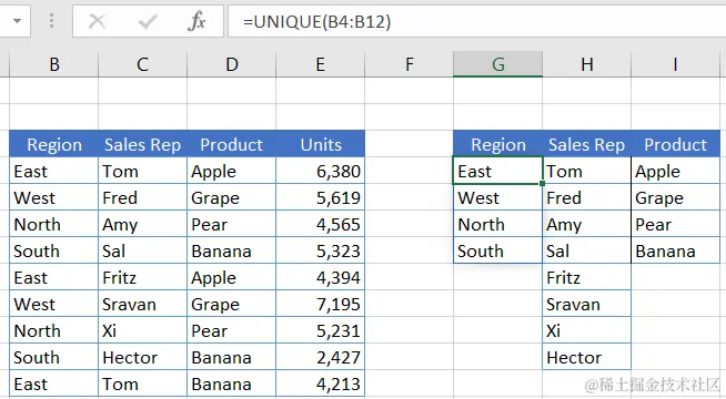 | **UNIQUE:**UNIQUE 公式允许您从项目范围或数组中返回唯一列表。UNIQUE(array, [by_col], occurs_once]) | sheet.getRange("$G$4:$I$4").setFormula2("=UNIQUE(B4: B12)"); |