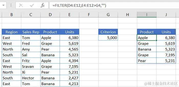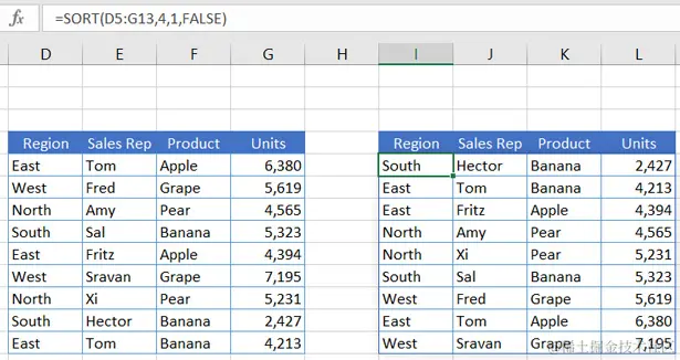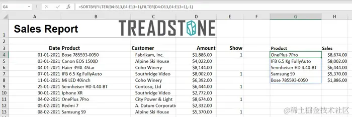 使用FILTER函数从产品列中过滤数据,然后使用SORTBY函数按照金额列的值进行降序排序。因此,我们将通过连接FILTER和SORTBY这两个动态数组函数来创建一个动态数组公式。