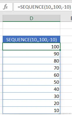 | **SEQUENCE :**SEQUENCE 公式允许您在数组中生成序列号列表。 SEQUENCE(rows,[columns],[start],[step]) | sheet.getRange("$D$4").setFormula2("=SEQUENCE(10,,100,-10)"); | |