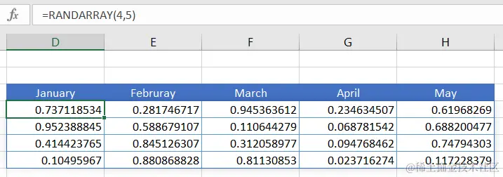 | **RANDARRAY:**RANDARRAY 公式允许您在数组中生成从 0 到 1 的随机 numbers 列表。 RANDARRAY ([rows],[columns]) | sheet.getRange("$D$3").setFormula2("=RANDARRAY(4,5)"); | |