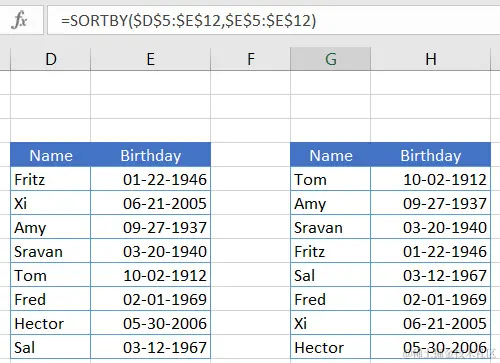 | **SORTBY :**SORTBY 公式允许您根据相应范围或数组中的值对范围或数组进行排序。 SORTBY(array, by_array1, [sort_order1], [[by_array2], [sort_order2]],...) | sheet.getRange("$G$5").setFormula2("=SORTBY($D$5:$E$12,$E$5:$E$12)"); | |