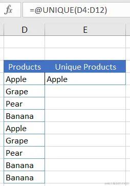 sheet.getRange("$E$4").setFormula2("=@UNIQUE(D4:D12)");