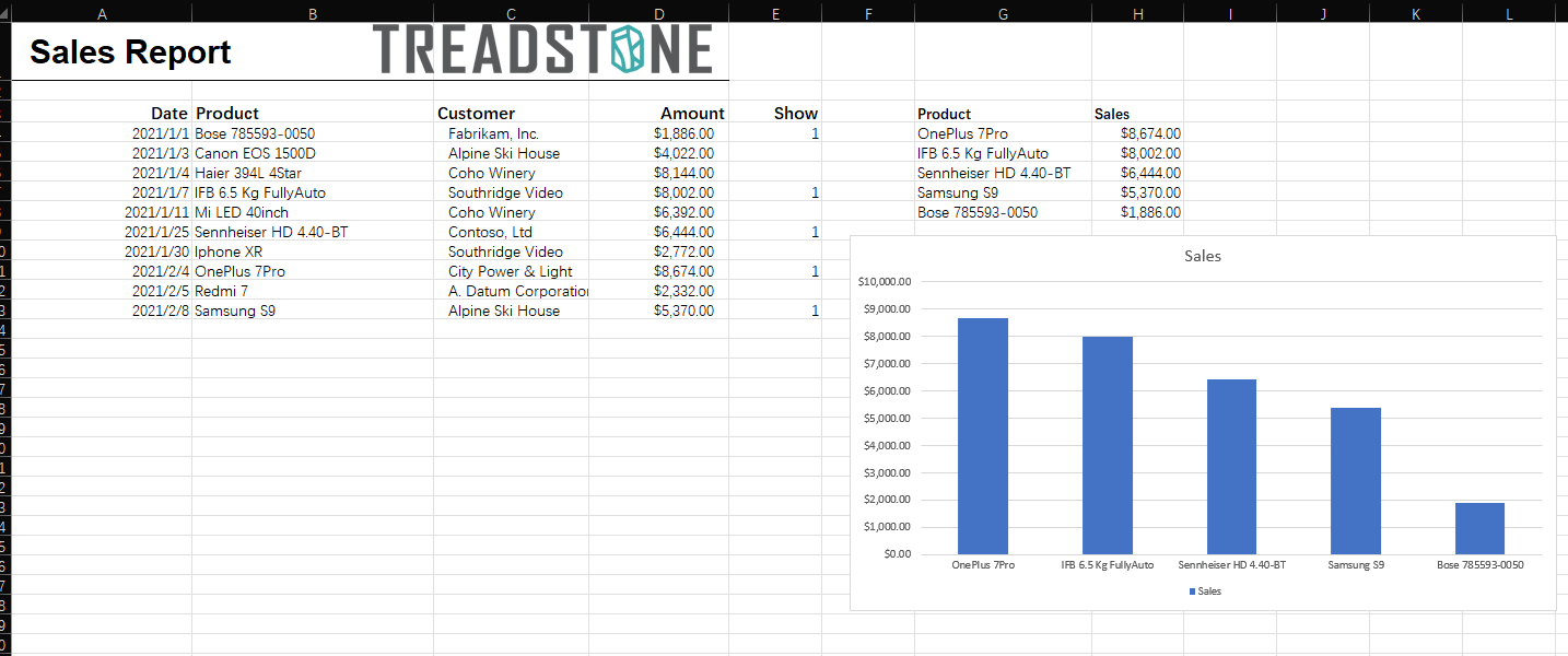 上述步骤已生成要在图表中绘制的数据。在这里,我们通过向工作表添加两个命名范围来添加一个简单的图表来展示销售额,其中一个引用筛选出的数据中的“产品”列,另一个引用“销售”列。然后,这些命名区域将用于创建图表系列。代码如下所示: