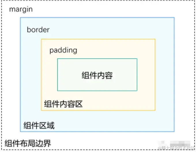 - 组件布局边界(虚线部分):组件通过margin属性设置外边距时,组件布局边界就是组件区域加上margin的大小。