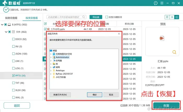 (4)确认所有需要恢复的文件都勾选完成后,点击【恢复】,并选择与扫描磁盘不同的磁盘保存文件。