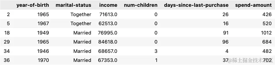 **提示: **#CONTEXT# 我卖酒。我有一个关于我的客户的信息数据集:[出生年份、婚姻状况、收入、孩子数量、距离上次购买的天数、花费金额]。