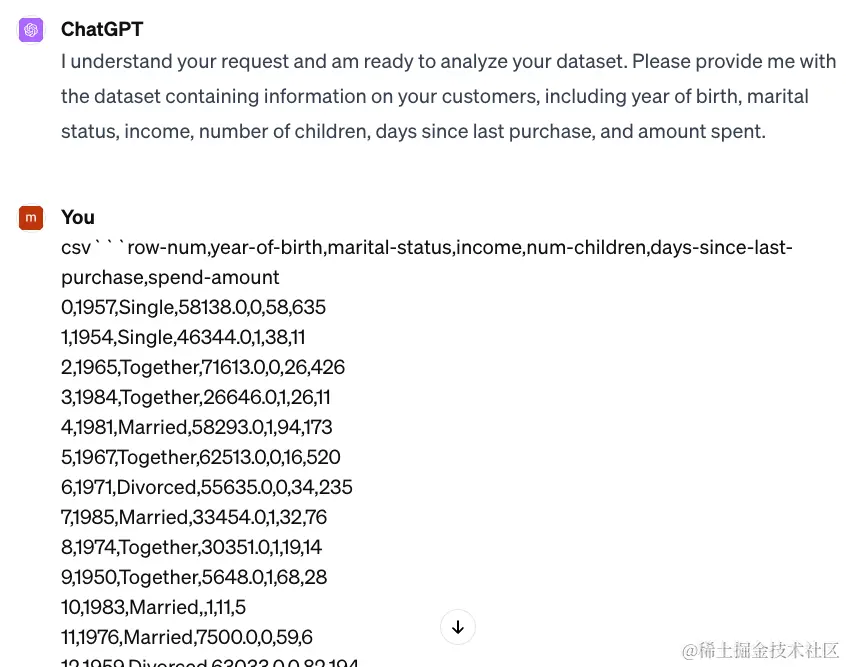 假设您在公司的营销团队工作。您的任务是利用此客户信息数据集来指导营销工作。这是一个分为两步的任务:首先,使用数据集生成有意义的客户群。接下来,就如何针对每个细分市场进行最佳营销提出想法。现在,这是一个实际的业务问题,LLM的模式发现(步骤 1)能力可以真正发挥作用。