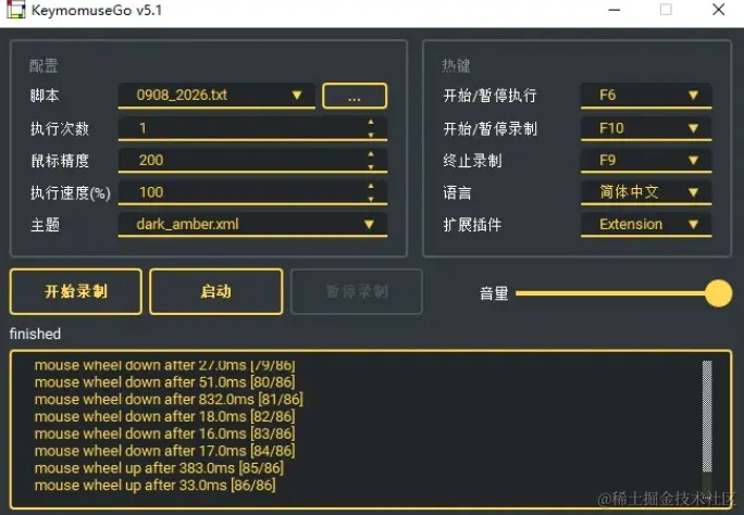 2、默认启动热键为 F6,功能等同于 启动 按钮;默认终止热键为 F9,按下后将会停止正在运行的脚本。