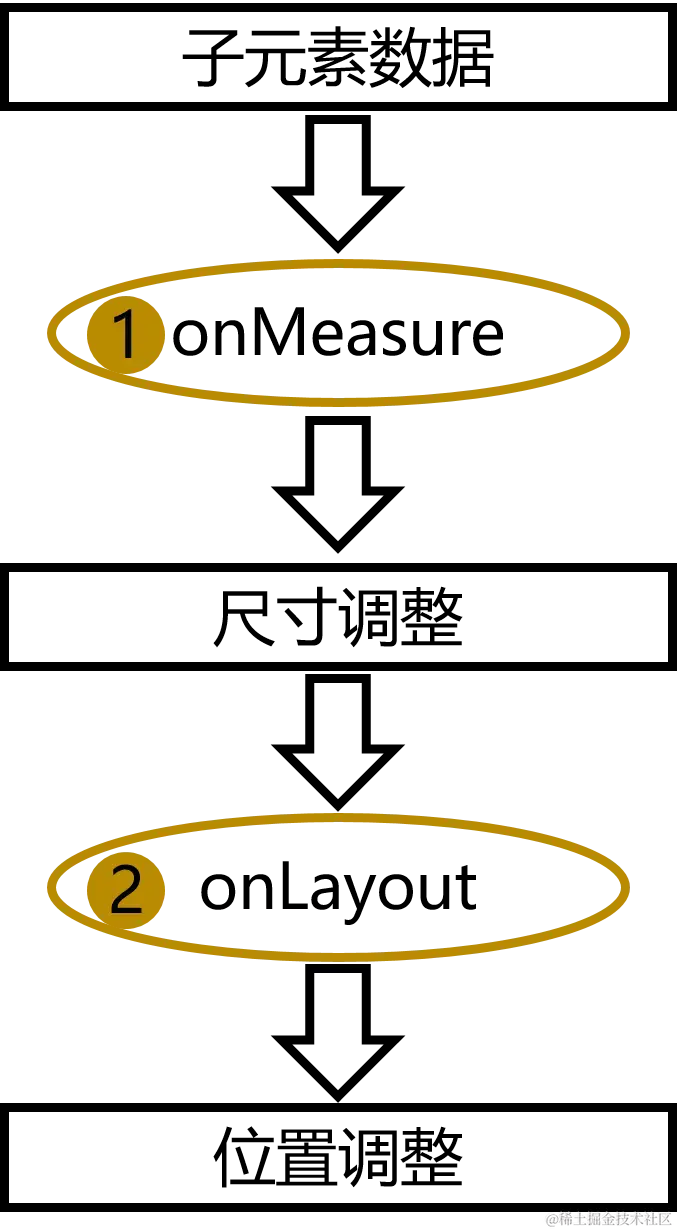 流程如下图所示,开发者通过onMeasure / onLayout拿到子组件数据后,通过measure测量每个组件大小,并根据开发者意图通过layout设置每个组件的位置,最终实现开发者想要的布局。