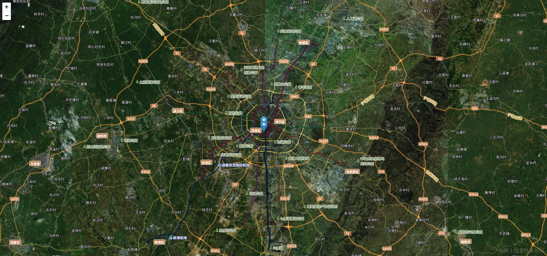 在使用插件后我们可以看到两个marker聚合成了一个点位,点击这个聚合点地图会自动缩放到可以展示原始点的层级