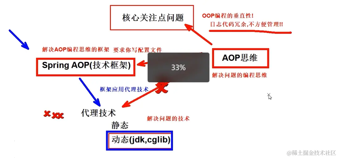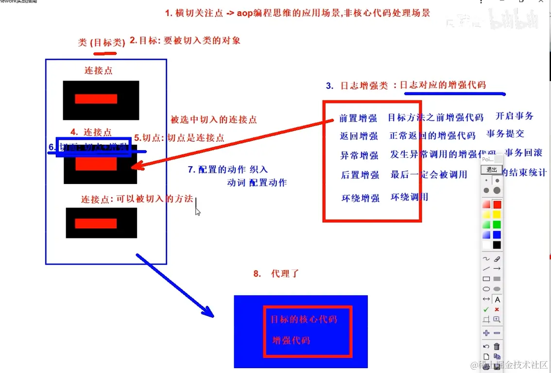 看图:按照数字标号来看,比如你要去砍这个老板,笑死了我就是复述一遍老师的例子。你要去砍这个类,就是老板,他身上可以砍的地方有头脖子腰腿,这些能砍的地方就是连接点。这把刀就是日志增强类,要去砍他的屁股也就是切点,一刀刷的下去就形了一个切面,下刀的这个动作叫配置的动作 织入,最后老板倒在血泊中变成一个凉凉的老板,就是一个代理。