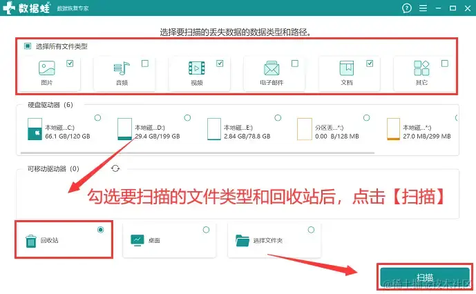步骤1:下载最新版本的软件后,运行软件,可以对需要扫描的文件类型进行选择,勾选 【回收站】 ,点击【扫描】 ;