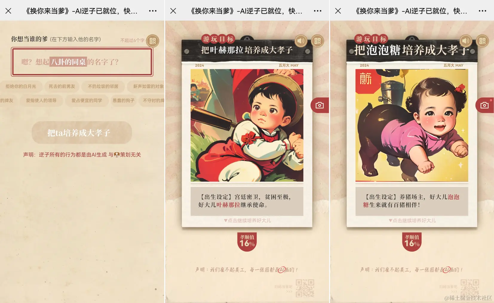 游戏最初在即刻平台出圈,随后传回微信社群,并成功激发起了玩家们「赛博养儿」的好奇心和战斗力。
