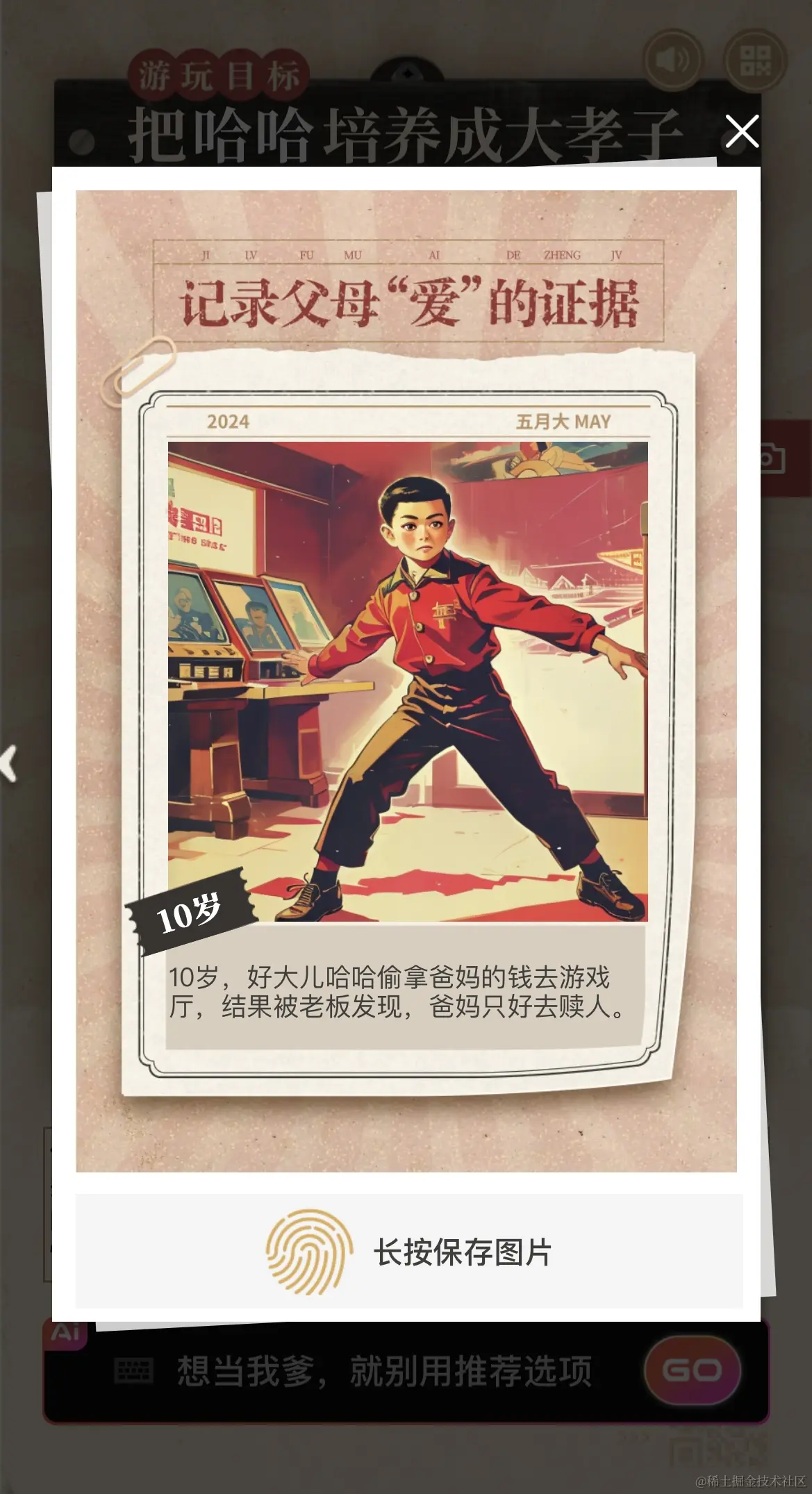 当然,仔细看还是能发现一些细节瑕疵,比如手指数量,但游戏的快乐体验让我们对此非常包容。而且,随着好大儿一岁岁长大,人物仍最大化保持了一致性(众所周知文生图的一致性一直是个大难题!